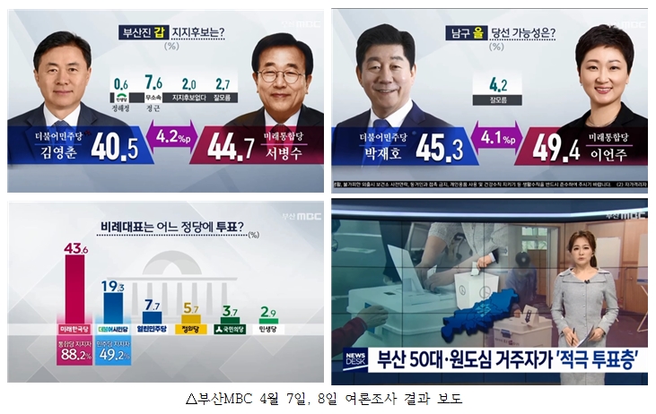 부산MBC는 4월 7일 <전국 최대 격전지 ‘부산진구갑.납구을’ 접전>, <‘낙동강 벨트’ 오차범위 내 접전>, <해운대 갑.연제, 통합당 오차범위 밖 ‘우세’>에서 여론조사 결과를 보도했다. 이어 4월 8일 <비례정당 선택 ‘더시민 19.3%’ ‘한국 43.6%’>에서는 ‘비례대표 정당투표’ 여론 조사 결과를 보도했고, <부산 50대‧원도심 거주자 ‘적극 투표층’>에서는 연령대별, 권역별 등으로 투표 의사를 물어 결과를 보도했다.