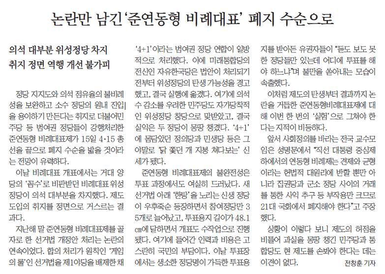 부산MBC가 4월 8일 <비례정당 선택 ‘더시민 19.3%’ ‘한국 43.6%’>에서 비례정당에 대한 여론조사를 실시해 더불어시민당, 미래한국당, 열린민주당 언급이 1건씩 있었다.