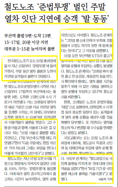 부산일보 <철도노조 ‘준법투쟁’ 벌인 주말 열차 잇단 지연에 승객 ‘발 동동’>(11.18) 기사에는 그간 인력이 부족해 안전규정을 지킬 수 없었다는 노조 관계자의 인터뷰와 이번 준법투쟁으로 승객 불편이 예상된다는 국토부 관계자의 인터뷰가 실렸습니다. 하지만 기사 제목의 ‘발 동동’이 담고 있는 내용은 국토부 관계자의 인터뷰 내용인 승객 불편이었습니다.