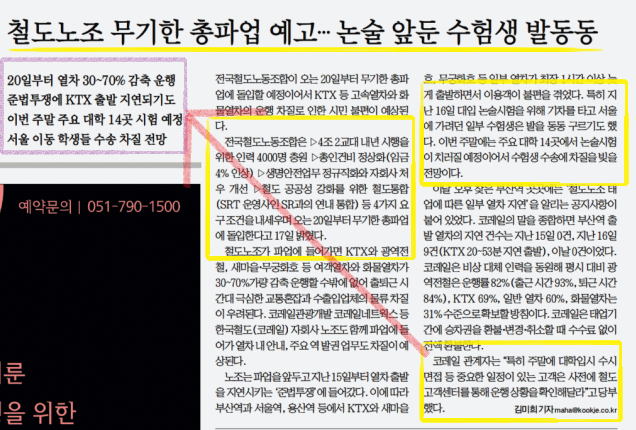 같은 날 국제신문의 <철도노조 무기한 총파업 예고···논술 앞둔 수험생 발 동동>(11.18) 기사에서도 ‘발 동동’이라는 표현이 사용된 것을 볼 수 있는데요. 부산일보가 노조와 국토부 양측의 입장을 실은 데 반해, 국제신문 기사에는 “특히 주말에 대학 입시 수시 면접 등 중요한 일정이 있는 고객은 사전에 철도고객센터를 통해 운행 상황을 확인해달라”고 말한 코레일 관계자의 인터뷰만 실렸습니다. 코레일 관계자의 발언은 ‘이번 주말 주요 대학 14곳 시험 예정’, ‘서울 이동 학생들 수송 차질 전망’이라는 기사의 소제목과도 연결되는 지점이 있어 보입니다.