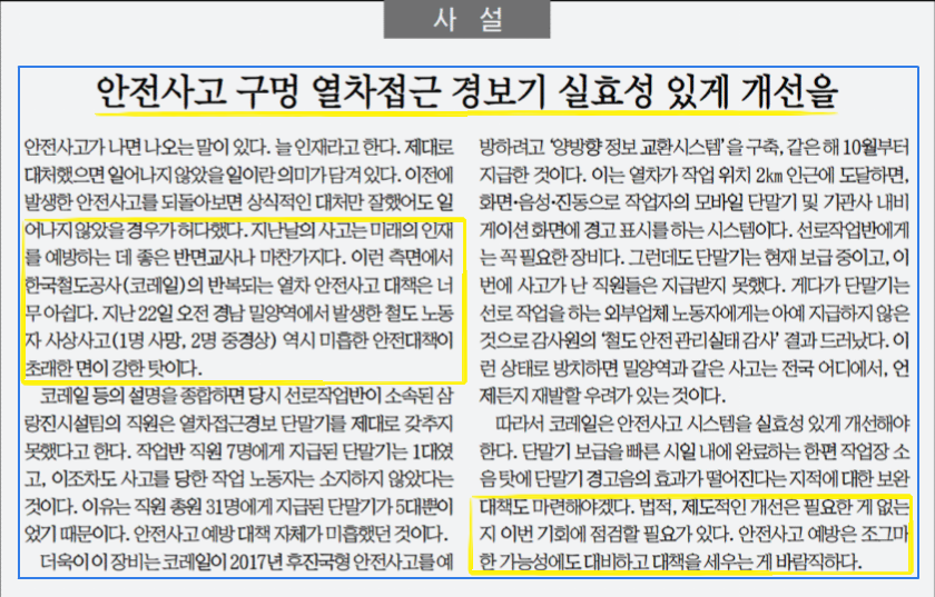 두 기사 모두 철도노조의 기자회견 내용 중 안전 인력 충원과 상례 작업 최소화를 요구하는 노조의 발언을 지면에 실었습니다. 국제신문은 10월 28일 사설을 통해 다시 한번 이번 사건을 반면교사 삼아 안전 대책을 마련할 것을 강조했는데요.