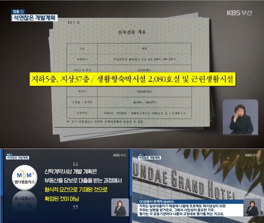 KBS부산의 문제 제기에 MDM플러스그룹은 대출을 받기 위한 형식적인 개발계획서에 불과하다고 밝혔으나, 기자의 취재에 따르면 금융권은 땅의 담보 가치와 구체적 사업계획 등을 평가해 돈을 빌려준 것이라고 합니다. 기자는 MDM 측이 호텔 터를 인수한 지 7개월이 넘도록 구체적인 개발계획을 내놓지 않고 있는 상황에서 해운대 난개발이 우려된다고 지적했습니다.