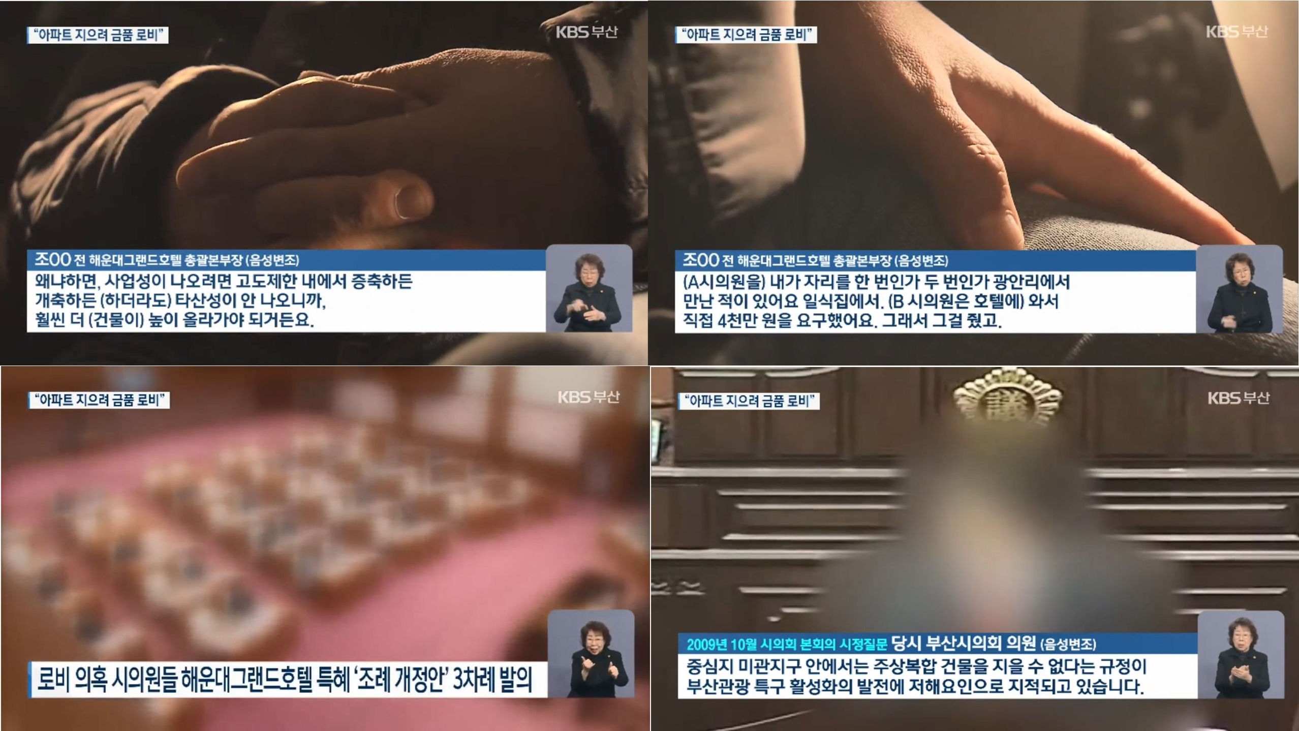 KBS부산은 ‘해운대 그랜드 호텔’ 개발 논란 보도를 다음 날에도 이어갔는데요. <“호텔 허물고 아파트 지으려 금품 로비”>(11/4, 공웅조 기자)에 따르면 해당 터의 용도 변경 추진 움직임은 이미 10년 전부터 있었다고 합니다. 2007년 해운대 그랜드호텔을 인수한 경영진은 그 당시부터 고도제한을 푼 뒤 주상복합건물을 짓는 계획을 세웠다는 건데요. 기자는 해운대그랜드 호텔 내부고발자의 발언을 토대로 당시의 용역계약서, 금품로비 정황 등을 전달했습니다.