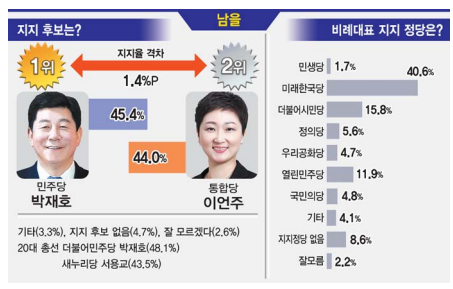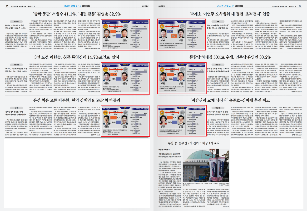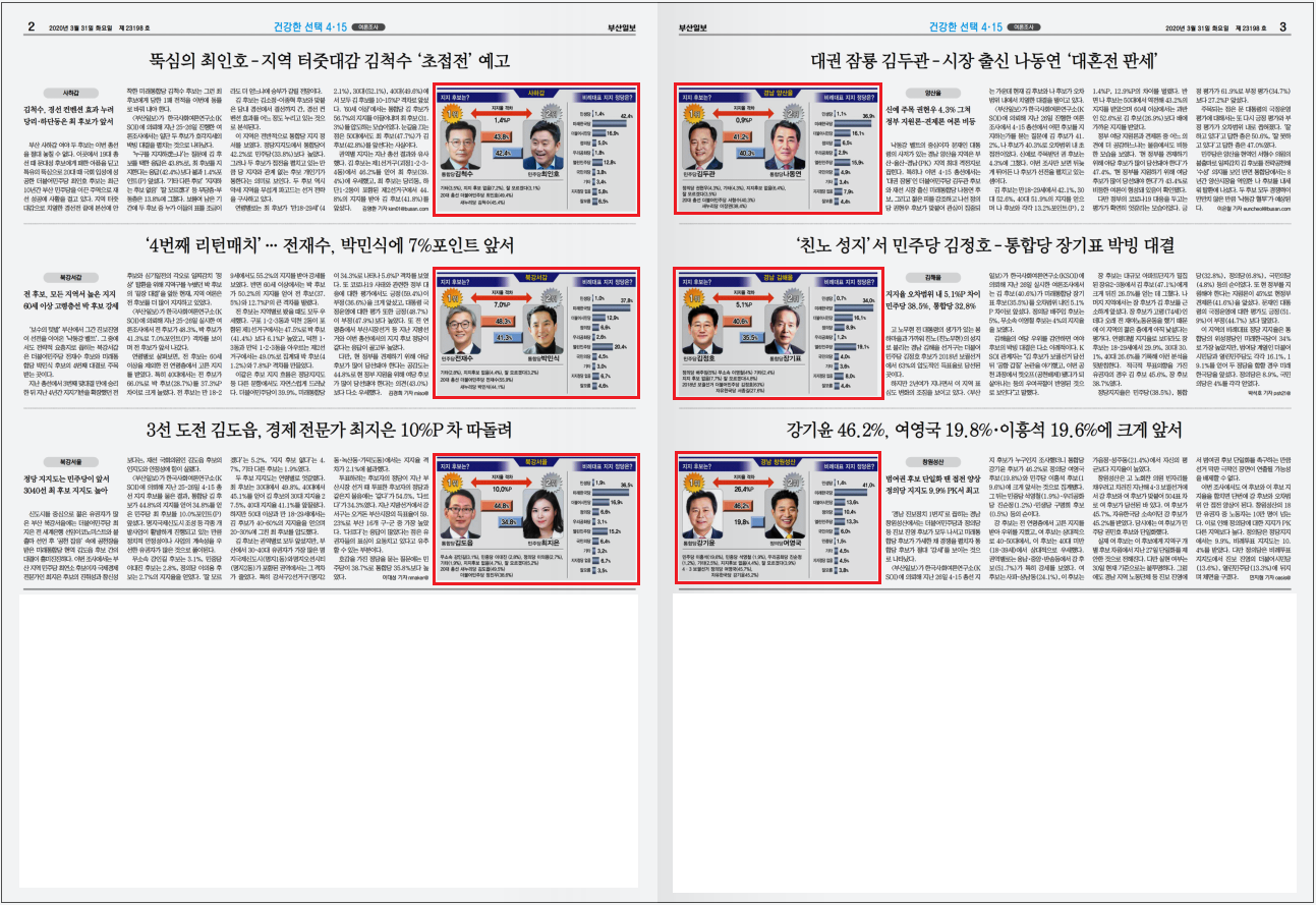 국제신문은 여론조사 결과를 나타낸 그래픽에서 여전히 거대 양당만을 주목할 수 있게 그려냈다. 코로나19로 조용한 유세가 대세가 되면서 인지도가 낮은 군소정당 소속의 후보들과 무소속 후보들은 더 큰 어려움을 겪고 있다. 이런 상황에서 언론도 거대 양당을 대변하는 스피커를 자처하면서 군소정당과 무소속 후보들의 목소리는 내지 않는 건 문제가 있다. 얼마 남지 않은 유세기간 동안 군소정당과 무소속 후보들을 소개하는 보도에 지면이 할애되기를 바란다.