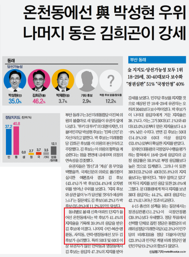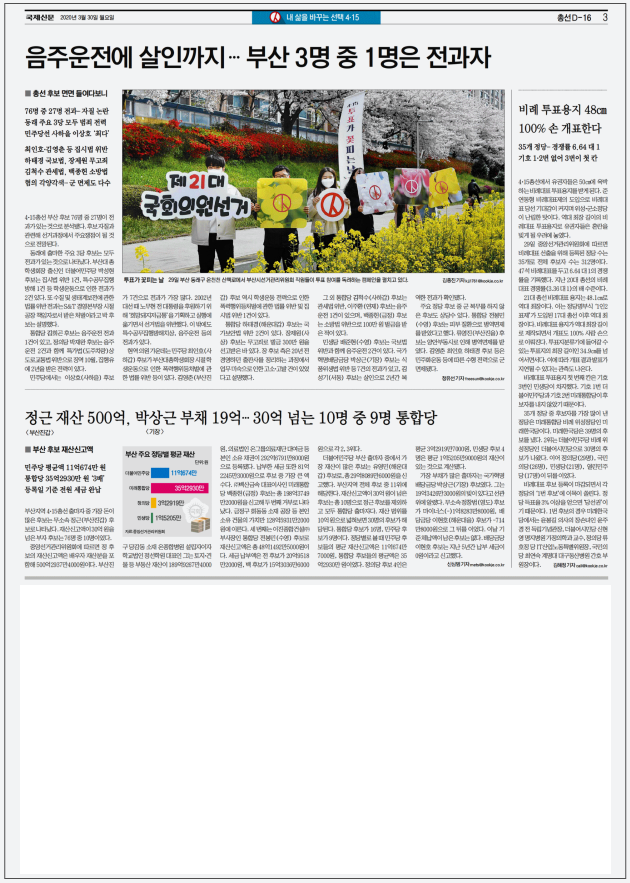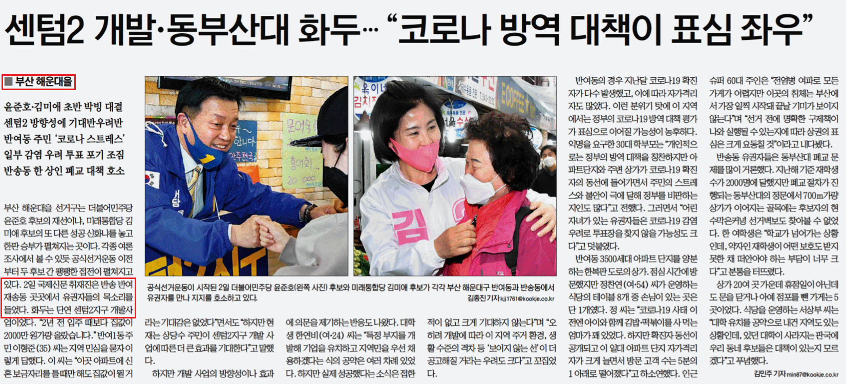 반면 국제신문 <센텀2 개발·동부산대 화두…“코로나 방역대책이 표심 좌우”>(4/3, 3면) 기사는 해당 지역구의 이슈와 그 이슈에 대한 지역구 유권자의 민심을 잘 담아낸 보도다. 기사가 함께 제시하고 있는 사진은 후보들의 선거운동 현장이지만 내용을 들여다보면, 후보의 동정이 아닌 지역이슈에 대한 다양한 의견을 담고 있다. 예를 들어, “반여1동 이형준(35) 씨는 지역민심을 묻자 이곳 집값이 뛸 거라는 기대감은 없었다, 하지만 현재는 상당수 주민이 센텀2지구 개발 사업에 따른 더 큰 효과를 기대한다”, “한연비(24) 씨는 특정 부지를 개발해 기업을 유치하고 지역민을 우선 채용하겠다는 식의 공약은 여러 차례 있었다. (중략) 오히려 개발에 따라 이 지역 주거 환경 생활수준의 격차 등 ’보이지 않는 선‘이 더 견고해 질 거라는 우려도 크다” 등, 지역 현안인 센텀2지구 개발을 둘러싼 유권자의 목소리를 직접 전달했다.