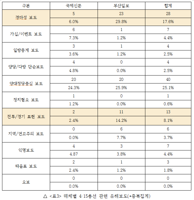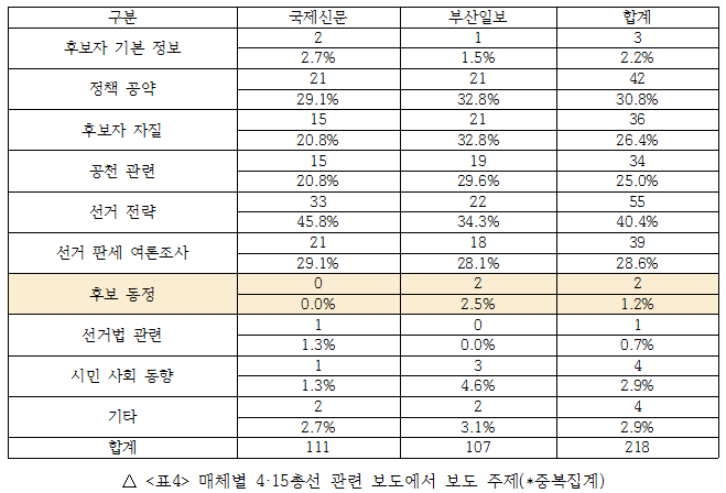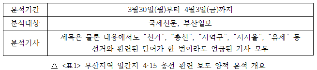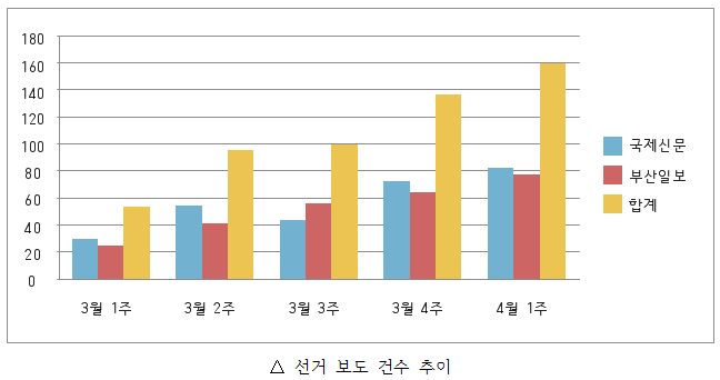 부산2020총선미디어감시연대지부는 부산지역 신문(국제신문, 부산일보)과 지상파방송 메인뉴스(KBS부산, 부산MBC, KNN 저녁종합뉴스)를 주요 대상으로 선거 보도 모니터링을 진행하고 있다. 다음은 국제신문과 부산일보를 대상으로 3월 30일(월)부터 4월 3일(금)까지 5일간 진행한 신문 모니터 5차 보고서이다.