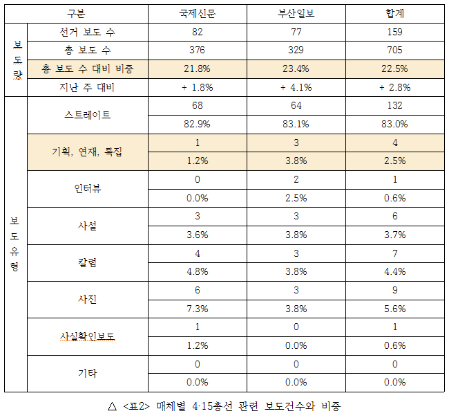 선거가 다가올수록 선거보도 건수는 눈에 띄게 증가하는 추세지만, 보도유형은 한 달 전과 크게 다르지 않다. 여전히 스트레이트 기사가 선거 보도의 80% 이상을 차지했다. 스트레이트 다음으로 많은 보도유형은 사진기사로, 5.6%의 비중을 보였다. 기획 보도는 단 2.5%에 머물렀다. 스트레이트는 기사의 가장 기본 유형으로 많은 비중을 차지하는 것은 당연한 면도 있으나, 선거를 코앞에 두고도 기획기사가 1건 내지 3건에 불과한 건 우려스럽다. 국제신문과 부산일보는 각각 3월 23일과 3월 16일, 1면을 통해 선거보도 기획을 실시하겠다고 알리기도 했다.