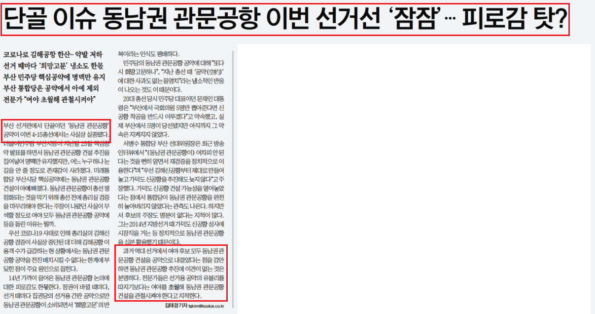 기사 제목에서처럼 이 이슈가 ‘잠잠’해진 이유도 기사에서도 언급됐듯, “14년 가까이 끌어온 동남권 관문공항 논의에 대한 피로감”, 이 사안이 정치적으로 이용된 측면이 있기 때문이다.