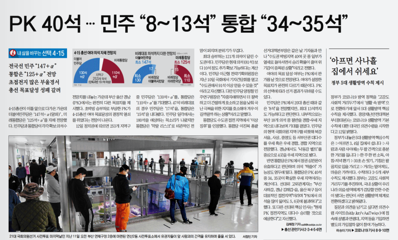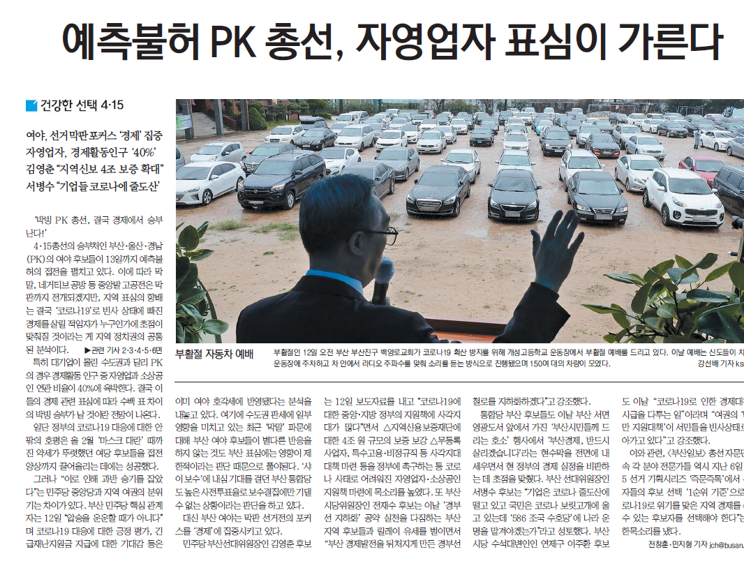 부산일보는 ‘박빙 PK 총선, 결국 경제에서 승부난다!’고 했다. 부울경 경제활동 인구 중 자영업과 소상공인 비율이 40%에 육박하는 상황을 예측의 근거로 제시했다. 여야 막판 선거운동의 포커스도 경제에 맞췄다며 더불어민주당 부산선대위는 코로나19에 대한 중앙·지방 정부 지원책의 사각지대를 보완하기 위한 방안을 촉구하고 경부선 지하화를 강조했으며, 미래통합당은 현 정부의 경제 실정을 비판했다고 전했다.