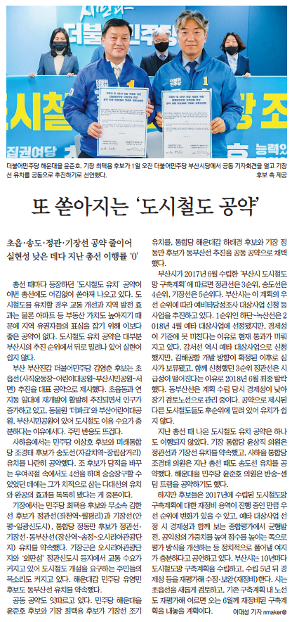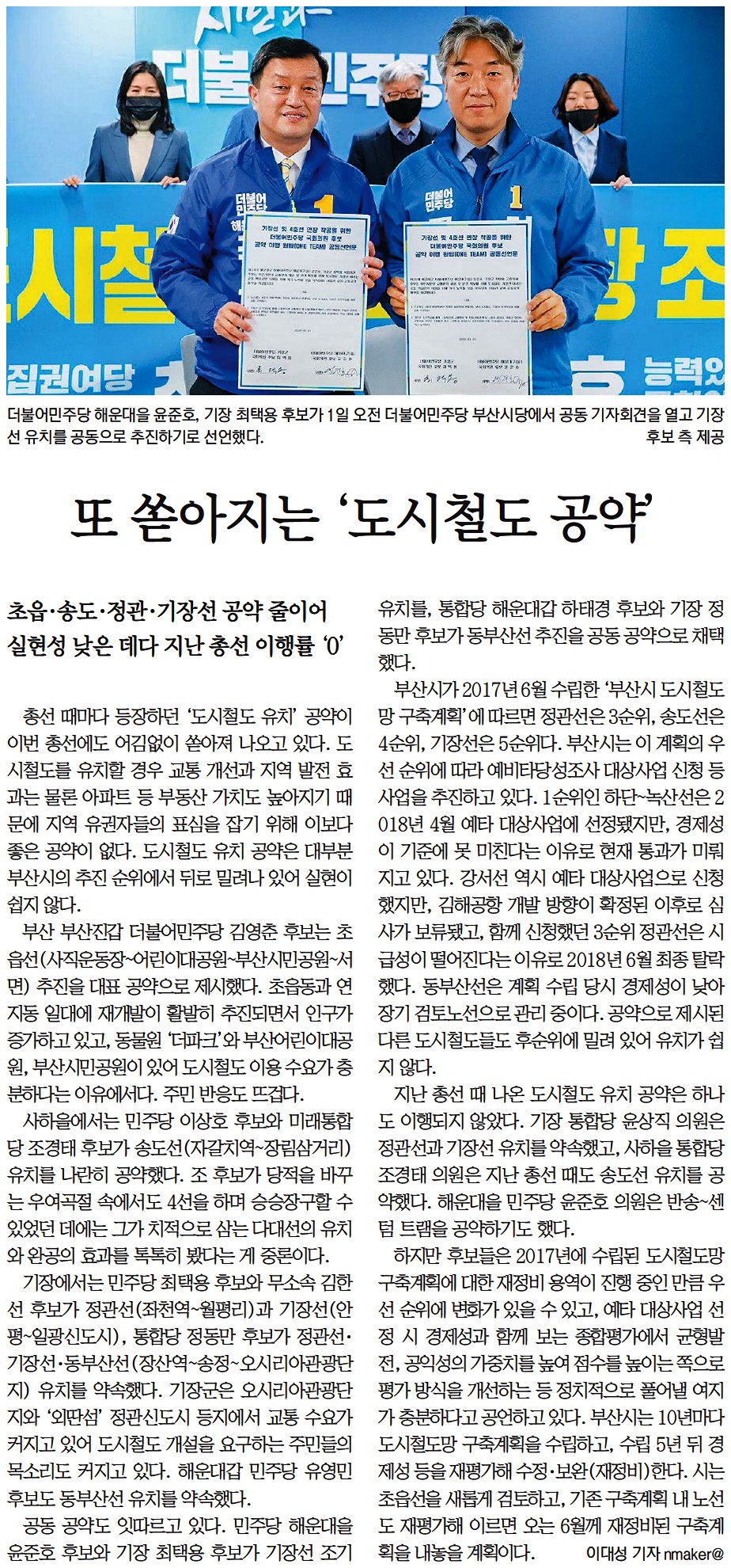 부산일보는 4월 2일 <또 쏟아지는 ‘도시철도 공약’>에서 총선 때마다 쏟아져 나오는 도시철도 유치 공약의 현실 가능성 검증했다. 부산시 도시철도망 구축계획에서 1순위인 하단~녹산선조차 경제성이 기준에 미치지 못해 통과가 미뤄졌고 다른 도시철도 사업들 역시 시급성과 경제성이 낮아 후순위에 밀려있는데 또 같은 공약을 들고 나오는 게 과연 타당한지 의문을 제기한 기사였다. “지난 총선 때 나온 도시철도 유치 공약은 하나도 이행되지 않았다”라고 평가했다.