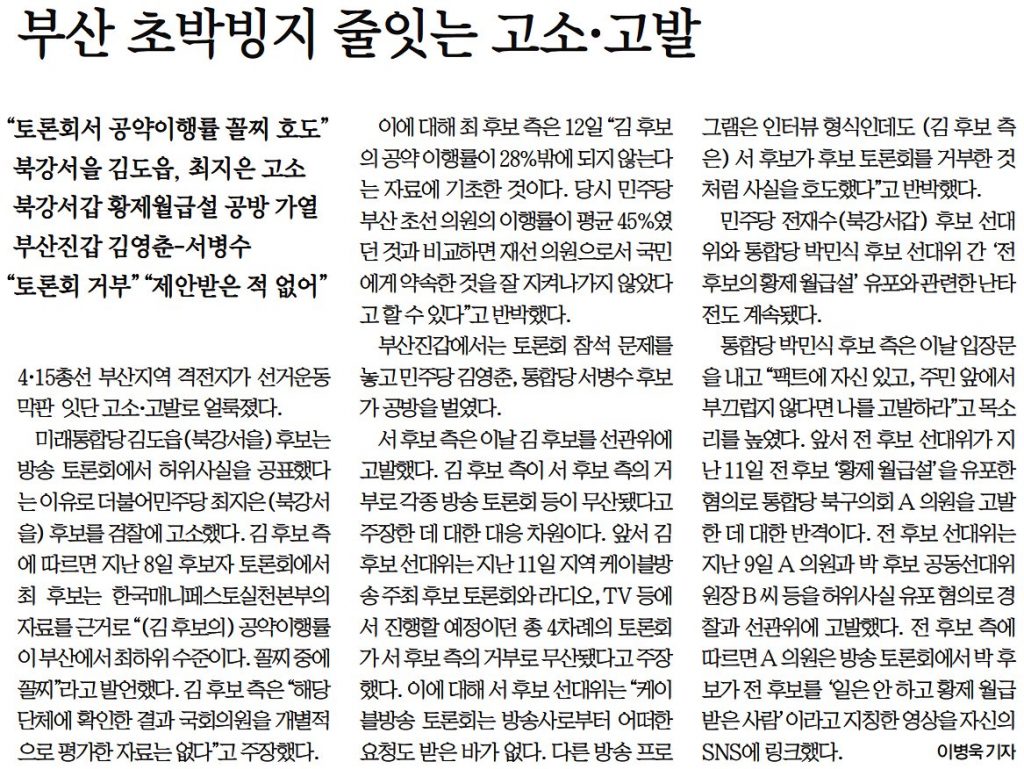 국제신문은 2면 <부산 초박빙지 줄잇는 고소·고발>에서 여야 간 공방을 벌이고 있는 3개 지역구 사례를 전했다. 북강서을 최지은 후보가 토론회에서 한국매니페스토실천본부 자료를 근거로 김도읍 의원의 공약 이행률이 꼴찌라고 한 데 대해 김도읍 의원이 허위사실 공표로 검찰 고발을 했다는 사실, 부산진갑 김영춘 후보의 주장에 따르면 서병수 후보가 케이블방송 주최 후보 토론회에 불참을 해 토론회가 무산됐다는데 서 후보는 방송사로부터 요청 자체를 받은 적 없다고 한다는 것, 북강서갑 박민식 후보를 지지하는 북구의회 A 의원이 전재수 후보를 ‘황제 월급 받은 사람’이라고 한 데 대한 난타전을 언급했다.