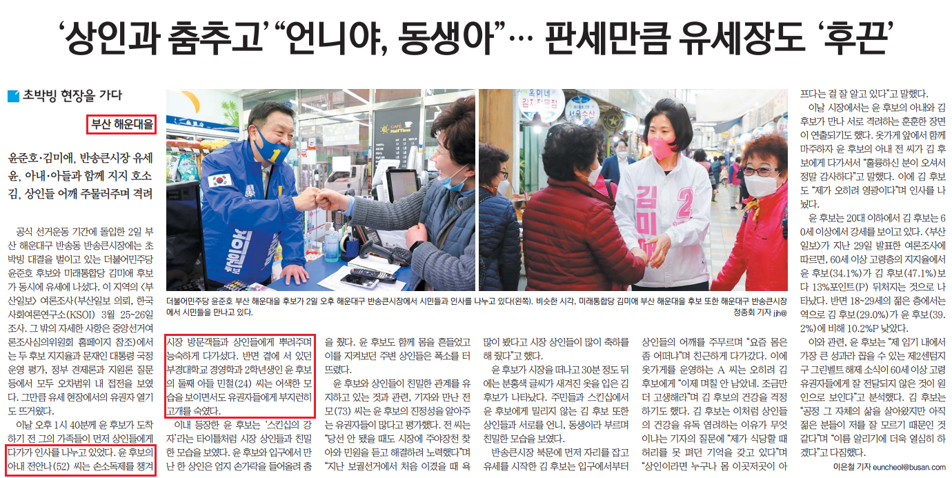 4월 2일 공식 선거운동이 시작되면서 신문 지면에서도 후보 동정 보도가 등장했다. <‘상인과 춤추고’ “언니야 동생아”…판세만큼 유세장도 ‘후끈’>(부산일보, 4/3, 4면)은 “윤 후보와 입구에서 만난 한 상인은 엄지손가락을 둘어 올려 춤을 췄다. 윤 후보도 함께 몸을 흔들었고…”, “주민들과 스킨십에서 윤 후보에게 밀리지 않는 김 후보 또한 상인들과 서로를 언니, 동생이라 부르며 친밀한 모습을 보였다.”라며 부산 해운대을 윤준호 후보와 김미애 후보의 유세 현장을 묘사했다. 현장감은 드러나지만, 이러한 동정보도를 통해서 유권자들에게 어떤 유익한 정보를 주고 싶은지는 의문이 드는 게 사실이다. 이런 가벼운 동정보도는 SNS 등 다른 플랫폼을 활용해 전달해도 충분하다.
