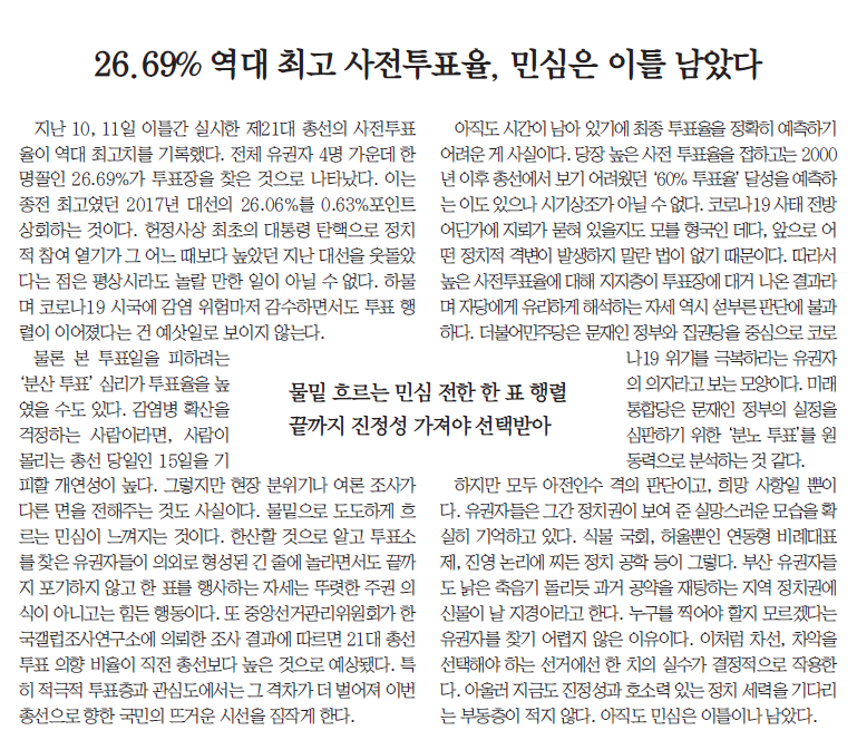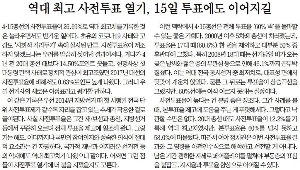 국제신문은 사설 <역대 최고 사전투표 열기, 15일 투표에도 이어지길>에서 ‘우려를 말끔히 씻어낸 결과’, ‘우리 선거사의 새로운 이정표라고 평가할 만하다’라고 했다. 국가적 재난과 어지러운 선거전이라는 악재 속에서도 역대 최고치 투표율이 나왔으니 ‘전체 투표율 60% 벽을 돌파할 수 있는 좋은 기회’라고 내다봤다. ‘여야 정치권은 이번 사전투표율 결과와 그 영향을 아전인수식으로 해석하고 선전할 게 아니다’라고 했지만 전반적으로 ‘국민의 참여의지와 성숙한 의식’에 무게를 둬 정치의 역동성을 강조했다.
