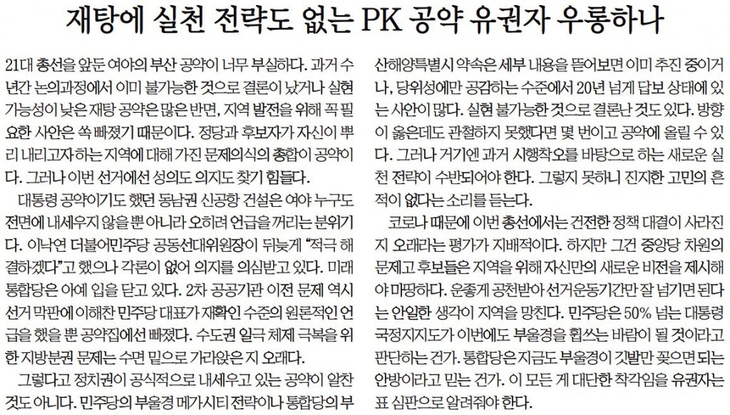 국제신문은 13일 사설 <재탕에 실천 전략도 없는 PK 공약 유권자 우롱하나>에서 더불어민주당과 미래통합당의 공약이 너무 부실하다고 꼬집었다. 국제신문이 제일 먼저 언급한 건 ‘동남권 신공항’ 공약이었다. 이번 총선에서 여야 누구도 전면에 내세우지 않고 있고, 대통령 선거 공약이기도 한데 여권도 여태 각론이 없어 ‘의지를 의심받고 있다’고 지적했다. 이 외 거시적인 정책이 당위성 수준에서 제안된 것이라거나 중앙과 별도로 지역에 나선 후보들이 자신만의 비전이 부재하다는 평가도 곁들이기는 했지만, 사설의 주제가 정당 차원의 PK 지역 공약이 부실하다는 내용임을 감안할 때 동남권 신공항 공약이 총선에서 수면 아래로 가라앉은 데 대한 비판이 무겁게 읽힌다. 코로나19 재난상황 속에서 치러지는 이번 총선에서 동남권 신공항 건설이 시기적절한 이슈인지 의문이다. 부산상공계는 최근 여야 정치권에 총선 10대 공약을 요구하고 지역신문에도 전면광고를 낸 바 있다. 지역상공계의 입장과 비슷한 공약 평가라고 할 수 있다.