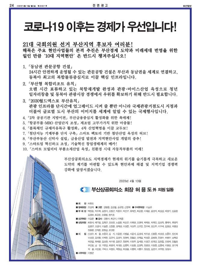 △부산상공회의소 ‘21대 총선 10대 지역현안’ 제안 (국제신문 4월 10일 24면 전면광고/ 부산일보 4월 13일 24면 전면광고 게재)