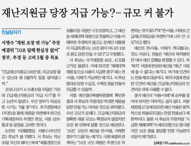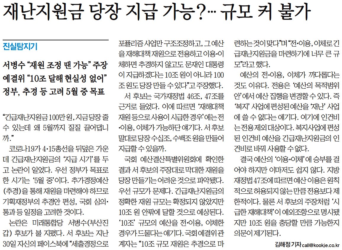 재난지원금이 주요 총선 이슈로 떠오르면서 정당들도 금액과 지급대상에 대한 각자의 정책을 내어놓고 있다. 국제신문은 4월 1일 <[진실탐지기] 재난지원금 당장 지급 가능?…규모 커 불가>에서 부산진갑 서병수 후보의 SNS 발언을 팩트체크했다. 서 후보는 “세출 경정으로 포퓰리즘 사업만 구조조정하고 그 예산을 재해 대책 재원으로 전용하고 이용, 이체하면 추경하지 않고도 문재인 대통령이 지급하겠다는 10조 원이 아니라 100조 원도 당장 만들 수 있다”고 했는데 이에 대해 국회 예결위 관계자의 견해를 들었다. 예산을 전·이용하거나 이체하는 조건이 까다로워, 서 후보의 주장처럼 다른 사업을 구조조정해 예산을 마련하는 방법도 쉽지 않다고 설명이었다.