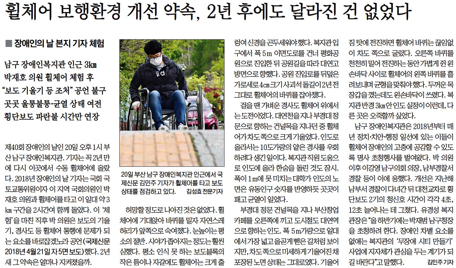 국제신문은 장애인의 날에 기자가 휠체어 보행 체험을 했습니다. 2년 전 했던 약속이 지켜졌는지 점검하기 위해서입니다. 당시 박재호 국회의원이 함께 휠체어 이동을 해 본 후, 통행에 문제되는 부분들을 개선하겠다고 했지만 달라진 건 없었다고 전했습니다. 이 기사는 남구장애인복지관이 박 의원 이외에도 정치와 치안, 행정 일선에 있는 이들을 초청해 장애인의 고충에 공감해달라고 했지만 실제 개선된 게 별로 없다며 ‘무장애 시티’를 만드는 데 지자체가 관심을 가져야 한다고 환기했습니다.