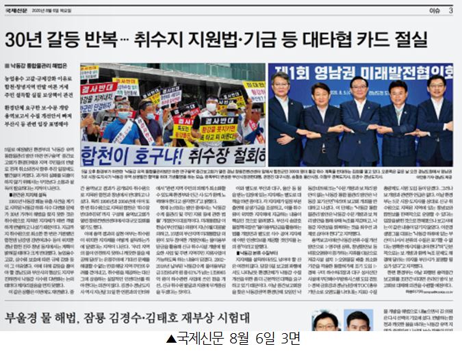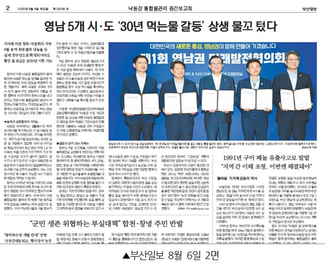 부산일보는 6일 1면 머릿기사 <…먹는물 불안 씻는다>에 이어 3면 <영남 5개 시·도 ‘30년 먹는물 갈등’ 상생 물꼬 텄다>에서 ‘이번 통합물관리 방안이 이전과는 다를 거라는 기대감’, ‘정부의 ’그린뉴딜‘ 계획에 포함된다면 일정은 더 당겨질 수 있다’라며 환영했고, 부산MBC는 황강 물이 ‘낙동강은 물론 남강보다도 수질이 좋’고, ‘부산시민의 30년 숙원이 해결될 단초를 마련’했다며 성과에 주목했습니다.
