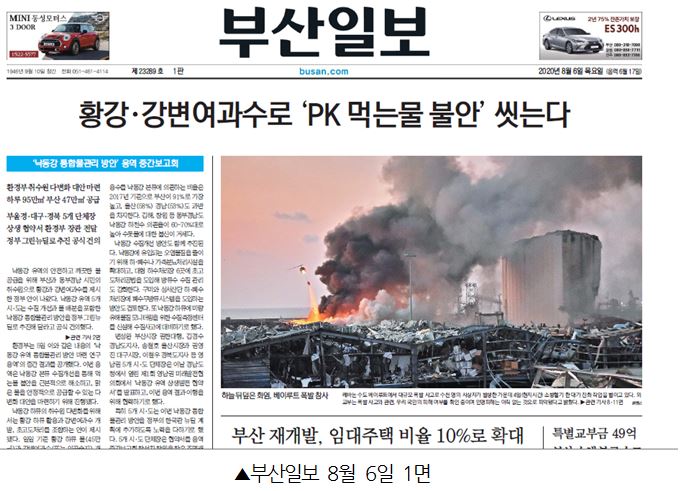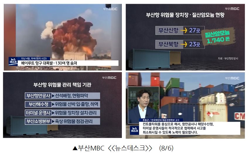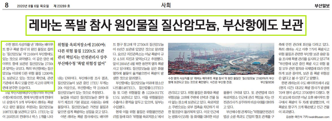 수천 명의 사상자를 낸 ‘레바논 베이루트 항구 폭발 참사’의 원인 물질로 꼽히는 ‘질산암모늄’이 부산항에도 있다는 사실을 부산일보와 부산MBC가 주목했습니다. 부산일보는 8월 6일 8면에 <레바논 폭발 참사 원인물질 질산암모늄, 부산항에도 보관> 기사를 부산MBC는 8월 6일 첫 순서로 <부산항 위험물 관리, ‘컨트롤타워’ 없다>를 리포팅 기사로 내보냈습니다.