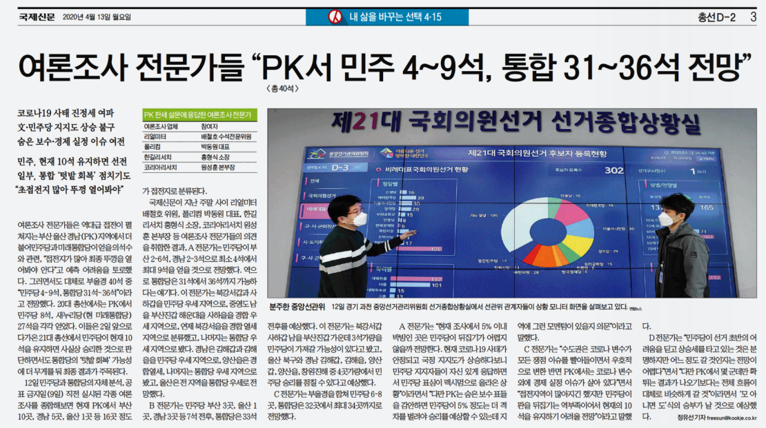 국제신문은 13일 총선 결과 예측의 두 가지 전망을 함께 실었다. 먼저 1면에서는 <PK 40석… 민주 “8~13석” 통합 “34~35석”>이라며 더불어민주당과 미래통합당이 내놓은 전망치를 보도했다. 3면에는 <여론조사 전문가들 “PK서 민주 4~9석, 통합 31~36석 전망”>이라는 여론조사 기관의 전망을 따로 실었다. 이 기사에 인용한 업체는 리얼미터, 폴리컴, 한길리서치, 코리아리서치 4개 회사였고 각 회사 참여자의 이름도 표로 밝혔다. 그런데 구체적 예측을 언급한 기사 내용에서는 ‘A 전문가’, ‘B 전문가’로 칭해 익명으로 처리했다. 전문가 전망치는 정당 내부 분석보다 더불어민주당 의석이 다소 줄어든 결과였다.