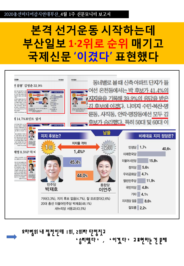 하지만 4월 첫째 주 부산지역 신문들은 여론조사 결과를 토대로 후보자 간 순위를 매기거나, ‘승리했다’, ‘이겼다’와 같은 단정적인 표현을 사용했다.