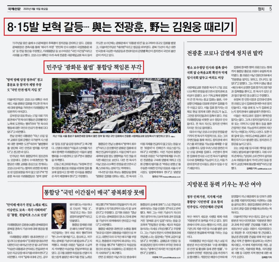 국제신문은 8월 18일 자 5면에 <8·15발 보혁 갈등…與는 전광훈, 野는 김원웅 때리기>라는 큰 제목을 달아 거대 양당의 타깃이 된 인물로 김원웅과 전광훈을 소개했는데요, 이 큰 제목 아래에 <민주당 ‘광화문 불법’ 통합당 책임론 부각>과 <통합당 “국민 이간질이 매국” 광복회장 뭇매>라는 작은 제목의 기사가 배치됐습니다. 코로나19 재확산 우려를 현실화한 전광훈 목사와 ‘친일청산’을 골자로 기념사를 한 김원웅 광복회장이라는 전혀 다른 사안을 ‘보혁 갈등’으로 뭉뚱그려 상반되는 사안인 양 보도한 셈입니다.