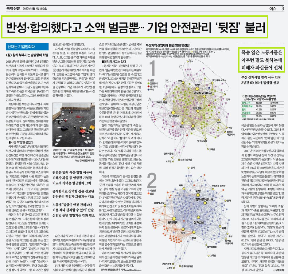 국제신문은 8월 4일부터 6일, 3일에 걸쳐 기획기사 [산재는 기업범죄다]를 연재했습니다. 산업재해와 관련한 여러 면면 중 국제신문이 주목한 건 ‘산재는 기업범죄’라는 인식 확산의 필요성이었습니다. <상> 참사 부추기는 솜방망이 처벌 편은 산업안전보건법을 위반한 사건들의 판결문 81건을 분석해 산재사건에서 피고인 양형 근거가 되는 단어들을 찾아냈습니다.