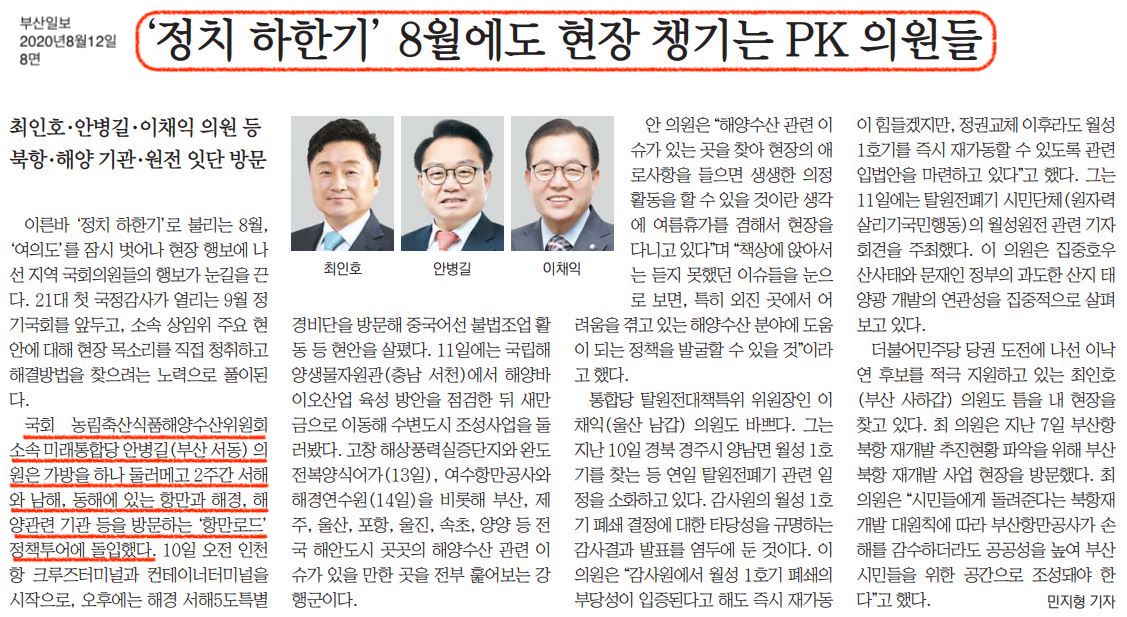 안병길 의원이 여름휴가를 겸해 떠난 ‘항만로드’ 정책투어 소식을 전한 언론사는 부산일보가 유일했습니다. 공교롭게도 안 의원은 이 부산일보의 사장 출신 정치인입니다.
