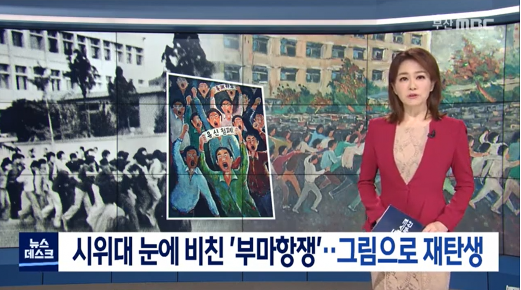 같은 날 부산MBC는 뉴스데스크에서 부마민주항쟁 41주년 기념식 소식과 사료 부족으로 진상규명이 더뎌지고 있는 점을 조명했습니다. <시위대의 눈에 비친 ‘부마항쟁’‥그림으로 재탄생>(류제민 기자)에서 당시의 모습을 그림으로 남겨 전시회를 연 ‘부마항쟁의 기억, 41년 전’ 전시회를 소개했는데요. 부마민주항쟁 당시 사진과 영상자료 등 사료가 거의 없어 진상규명에 어려움을 겪고 있음을 전하기도 했습니다.