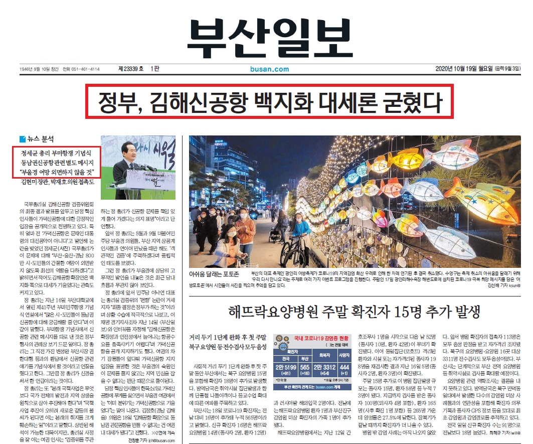한편, 10월 19일 1면 머릿기사로 정세균 총리의 부마민주항쟁 기념사 중 신공항 관련 발언에 주목한 기사를 실었습니다(<정부, 김해신공항 백지화 대세론 굳혔다>, 전창훈 기자). 기사는 “부울경 여망 외면하지 않을 것”이라는 정총리의 말을 강조하며, 정부가 김해신공항 백지화에 무게를 싣는 것이 아니냐는 전망을 했는데요. 이는 정총리 기념사에서 부마항쟁 의미와 피해자 명예회복에 대한 발언보다는 ‘신공항’ 관련 메시지에 더 집중한 모양새였습니다.