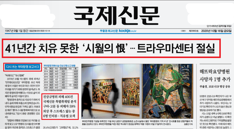 16일 1면 <41년간 치유 못한 ‘시월의 恨’···트라우마센터 절실>(김화영·신심범 기자) 기사에서 부마항쟁 피해자들의 트라우마를 치료할 치유 센터가 필요함을 강조했습니다. 또한 <“부마 취재했다 A급 중대사범 찍혀··· 7년간 기자생활 못 해”>(김화영 기자), <항쟁 다음날, 신문엔 기사 한 줄 없었다>(김화영 기자), <부마 관련자 요주의 인물 낙인에 생활 애로··· 배·보상 강화를>(김미희·민경진 기자) 기사를 연달아 실어, 부마항쟁 피해자들의 생생한 증언과 제대로 된 피해자 보상이 이뤄지지 않고 있는 현실을 짚었습니다.